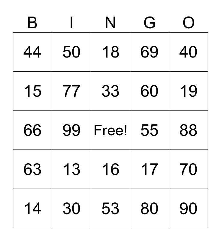 This bingo card has a free space and 24 words: 13, 30, 33, 14, 40, 44, 15, 50, 55, 16, 60, 66, 17, 70, 77, 80, 88, 18, 19, 99, 90, 63, 69 and 53.