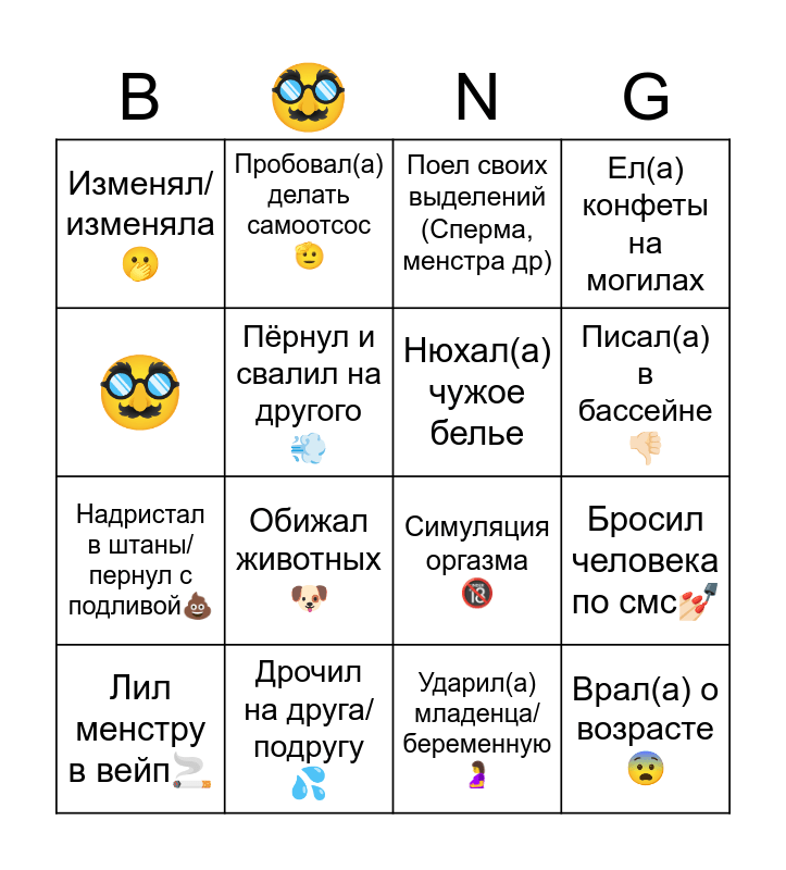 This bingo card has 16 words: Дрочил на друга/подругу💦, Бросил человека по смс💅🏻, Поел своих выделений (Сперма, менстра др), Изменял/изменяла 🫢, Надристал в штаны/пернул с подливой💩, Пробовал(а) делать самоотсос🫡, Симуляция оргазма 🔞, Ударил(а) младенца/беременную 🤰, 🥸, Пёрнул и свалил на другого 💨, Лил менстру в вейп🚬, Ел(а) конфеты на могилах, Обижал животных 🐶, Писал(а) в бассейне 👎🏻, Нюхал(а) чужое белье and Врал(а) о возрасте 😨.