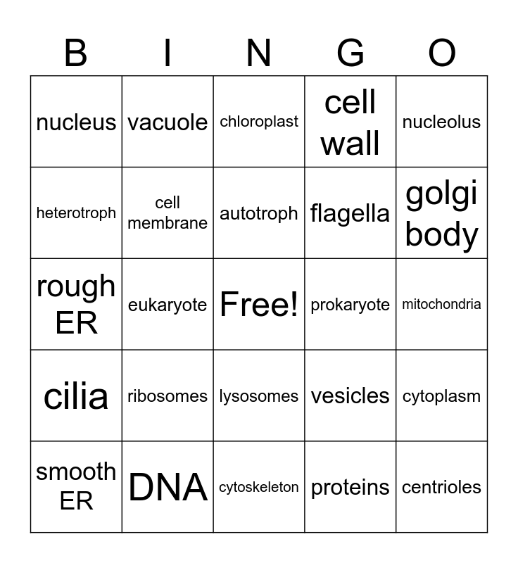 This bingo card has a free space and 24 words: ribosomes, DNA, autotroph, smooth ER, nucleolus, nucleus, heterotroph, vacuole, prokaryote, lysosomes, flagella, rough ER, vesicles, cytoplasm, cell membrane, proteins, mitochondria, chloroplast, golgi body, eukaryote, centrioles, cilia, cell wall and cytoskeleton.