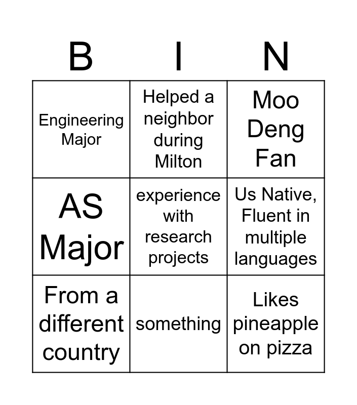 This bingo card has 9 words: From a different country, Moo Deng Fan, Helped a neighbor during Milton, AS Major, Engineering Major, Us Native, Fluent in multiple languages, experience with research projects, Likes pineapple on pizza and something.