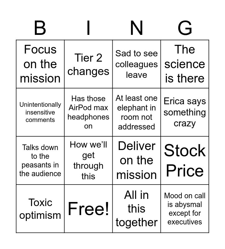 This bingo card has 16 words: Free!, Stock Price, Sad to see colleagues leave, Focus on the mission, Talks down to the peasants in the audience, Tier 2 changes, Deliver on the mission, All in this together, Unintentionally insensitive comments, Has those AirPod max headphones on, Toxic optimism, The science is there, How we’ll get through this, Erica says something crazy, At least one elephant in room not addressed and Mood on call is abysmal except for executives.