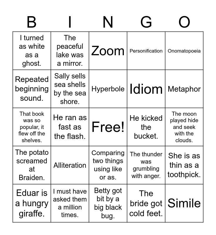 This bingo card has a free space and 24 words: Alliteration, I must have asked them a million times., Hyperbole, Eduar is a hungry giraffe., Onomatopoeia, I turned as white as a ghost., Repeated beginning sound., The peaceful lake was a mirror., He kicked the bucket., Comparing two things using like or as., Idiom, That book was so popular, it flew off the shelves., The thunder was grumbling with anger., She is as thin as a toothpick., Sally sells sea shells by the sea shore., The bride got cold feet., The moon played hide and seek with the clouds., Zoom, Metaphor, He ran as fast as the flash., Simile, The potato screamed at Braiden., Personification and Betty got bit by a big black bug..