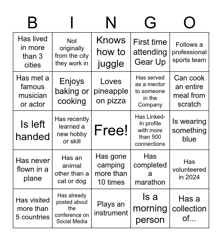 This bingo card has a free space and 24 words: Has an animal other than a cat or dog, Has already posted about the conference on Social Media, Loves pineapple on pizza, Has visited more than 5 countries, Follows a professional sports team, Has lived in more than 3 cities, Has met a famous musician or actor, Not originally from the city they work in, Has Linked-In profile with more than 500 connections, Has gone camping more than 10 times, Has served as a mentor to someone in the Company, Is left handed, Has completed a marathon, Has volunteered in 2024, Enjoys baking or cooking, Is a morning person, Is wearing something blue, Knows how to juggle, Can cook an entire meal from scratch, Has recently learned a new hobby or skill, Has a collection of..., Has never flown in a plane, First time attending Gear Up and Plays an instrument.