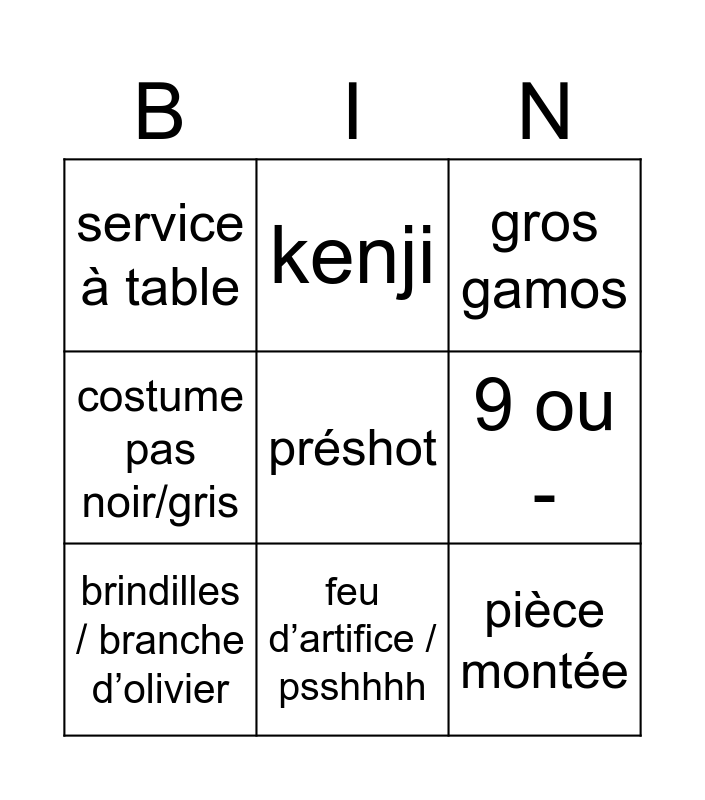 This bingo card has a free space and 8 words: 9 ou -, gros gamos, kenji, brindilles / branche d’olivier, service à table, pièce montée, costume pas noir/gris and feu d’artifice / psshhhh.