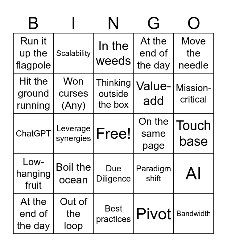 This bingo card has a free space and 39 words: Slack, Microsoft Teams, AIX, Won curses (Any), At the end of the day, Due Diligence, Thinking outside the box, Let's circle back, Move the needle, Low-hanging fruit, Leverage synergies, At the end of the day, Bandwidth, Touch base, On the same page, Boil the ocean, Win-win situation, Run it up the flagpole, Take it offline, Paradigm shift, Hit the ground running, Best practices, Value-add, Mission-critical, Streamline, Core competencies, Get buy-in, Take ownership, Push the envelope, Scalability, It is what it is, Drill down, In the weeds, Out of the loop, Pivot, Table the discussion, AI, ChatGPT and Work from Home.