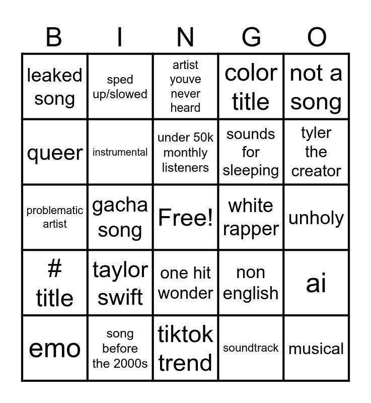 This bingo card has a free space and 24 words: taylor swift, song before the 2000s, under 50k monthly listeners, emo, not a song, leaked song, queer, sped up/slowed, white rapper, one hit wonder, sounds for sleeping, problematic artist, non english, ai, instrumental, soundtrack, unholy, artist youve never heard, tyler the creator, gacha song, musical, # title, color title and tiktok trend.