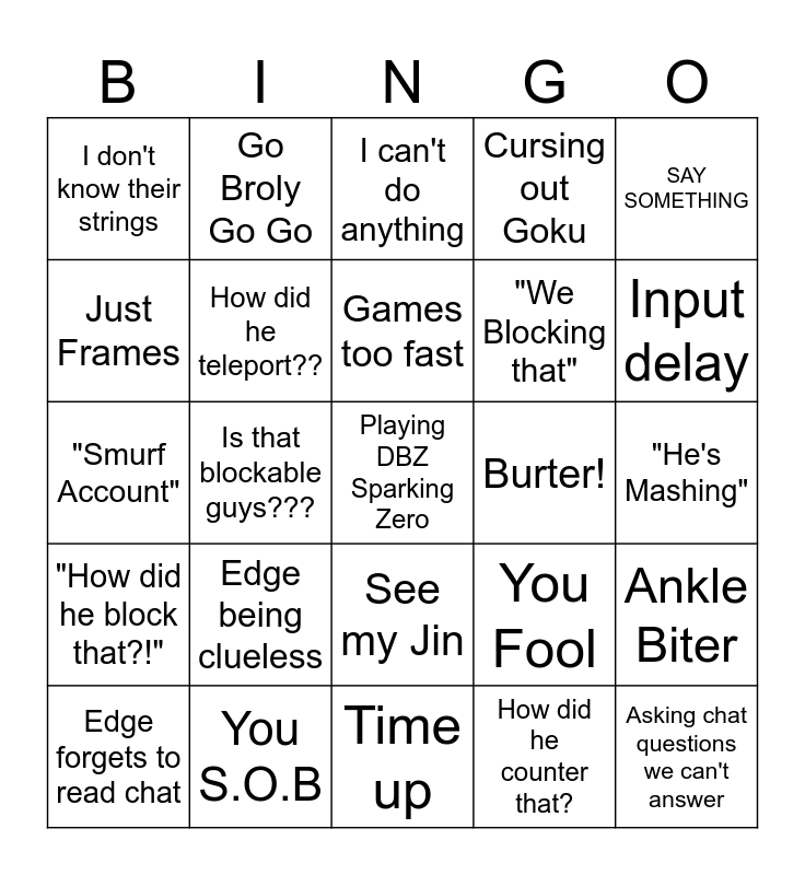 This bingo card has a free space and 24 words: Edge being clueless, You S.O.B, Games too fast, Edge forgets to read chat, SAY SOMETHING, I don't know their strings, Just Frames, Go Broly Go Go, Burter!, See my Jin, "We Blocking that", "Smurf Account", You Fool, Ankle Biter, How did he teleport??, How did he counter that?, "He's Mashing", I can't do anything, Input delay, Is that blockable guys???, Asking chat questions we can't answer, "How did he block that?!", Cursing out Goku and Time up.