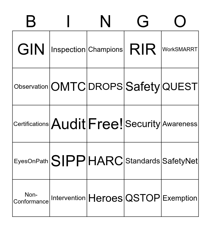 This bingo card has a free space and 24 words: SIPP, Intervention, DROPS, Non-Conformance, WorkSMARRT, GIN, Observation, Inspection, Security, HARC, Safety, Certifications, Standards, SafetyNet, OMTC, QSTOP, Awareness, Champions, QUEST, Audit, Exemption, EyesOnPath, RIR and Heroes.