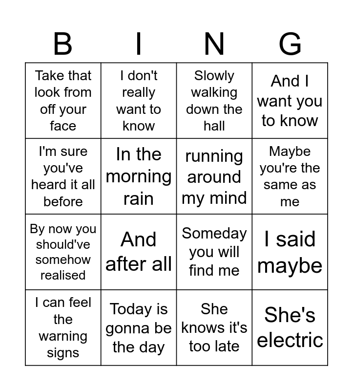 This bingo card has 16 words: Today is gonna be the day, I said maybe, Slowly walking down the hall, Take that look from off your face, By now you should've somehow realised, I don't really want to know, Someday you will find me, She knows it's too late, I'm sure you've heard it all before, In the morning rain, I can feel the warning signs, And I want you to know, And after all, Maybe you're the same as me, running around my mind and She's electric.