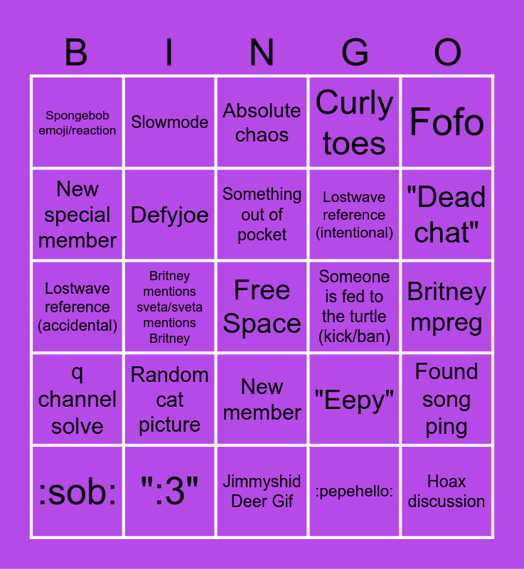 This bingo card has a free space and 25 words: Random cat picture, Jimmyshid Deer Gif, Something out of pocket, :sob:, Fofo, Spongebob emoji/reaction, New special member, Slowmode, Someone is fed to the turtle (kick/ban), New member, Lostwave reference (intentional), Lostwave reference (accidental), "Eepy", Found song ping, Defyjoe, Someone is timed out, Britney mpreg, Absolute chaos, "Dead chat", Britney mentions sveta/sveta mentions Britney, Hoax discussion, ":3", q channel solve, Curly toes and :pepehello:.