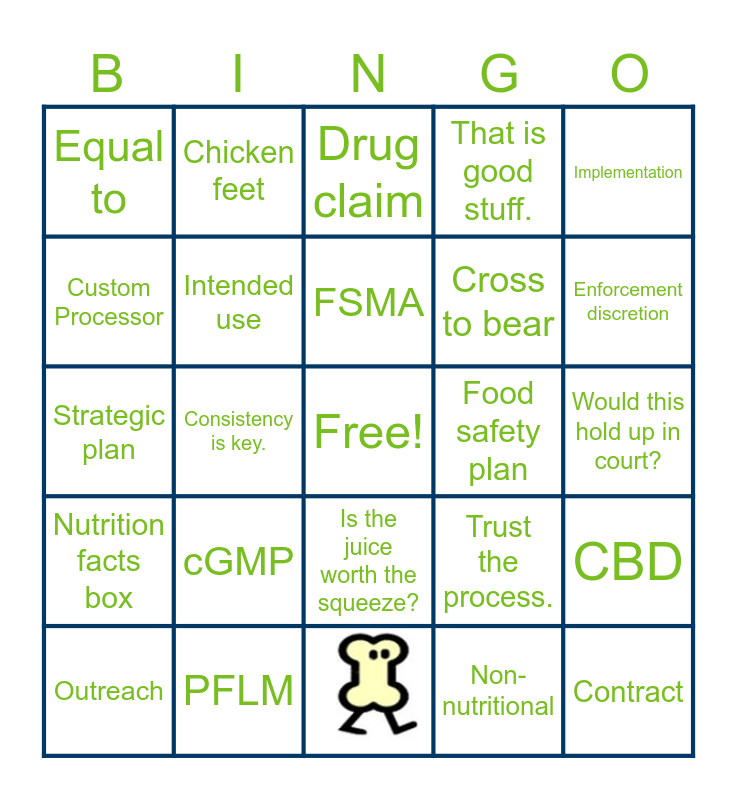 This bingo card has 1 images, a free space and 23 words: cGMP, PFLM, FSMA, Outreach, Implementation, Equal to, Custom Processor, Chicken feet, Food safety plan, Is the juice worth the squeeze?, Cross to bear, Strategic plan, Trust the process., CBD, Intended use, Non-nutritional, Would this hold up in court?, Drug claim, Enforcement discretion, Consistency is key., Contract, Nutrition facts box and That is good stuff..