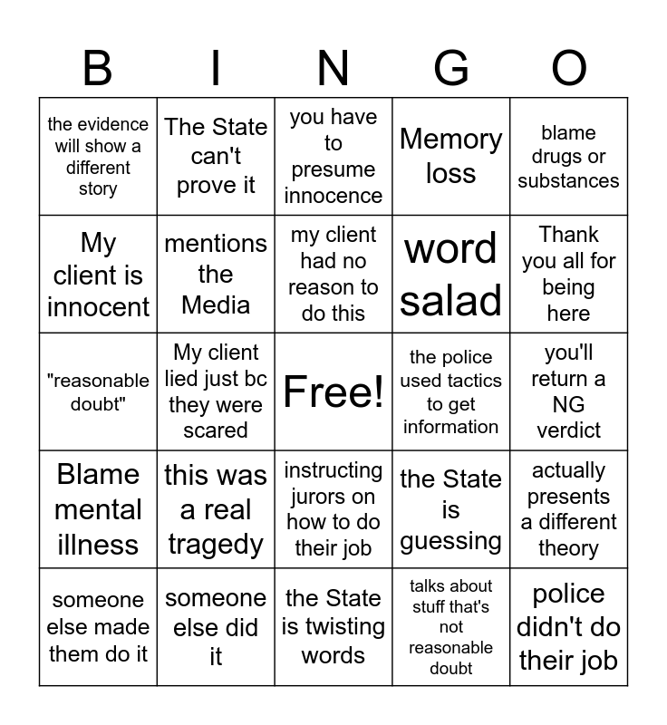 This bingo card has a free space and 24 words: this was a real tragedy, someone else did it, my client had no reason to do this, someone else made them do it, blame drugs or substances, the evidence will show a different story, My client is innocent, The State can't prove it, the police used tactics to get information, instructing jurors on how to do their job, word salad, "reasonable doubt", the State is guessing, actually presents a different theory, mentions the Media, talks about stuff that's not reasonable doubt, you'll return a NG verdict, you have to presume innocence, Thank you all for being here, My client lied just bc they were scared, police didn't do their job, Blame mental illness, Memory loss and the State is twisting words.