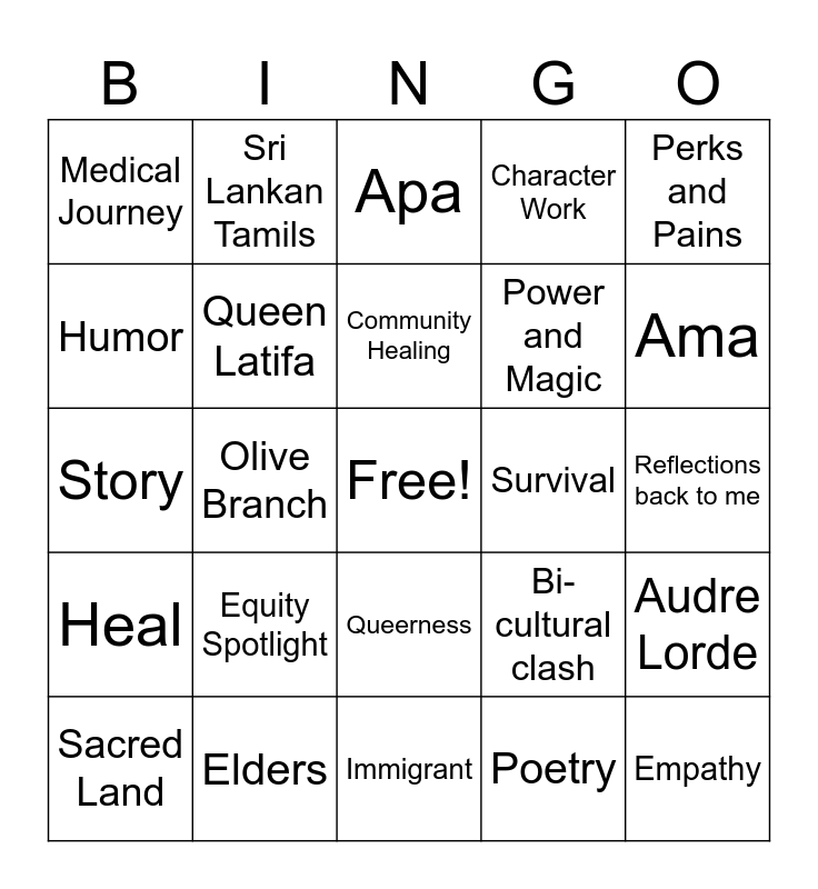 This bingo card has a free space and 24 words: Equity Spotlight, Elders, Community Healing, Sacred Land, Perks and Pains, Medical Journey, Humor, Sri Lankan Tamils, Survival, Queerness, Power and Magic, Story, Bi-cultural clash, Audre Lorde, Queen Latifa, Poetry, Reflections back to me, Apa, Ama, Olive Branch, Empathy, Heal, Character Work and Immigrant.