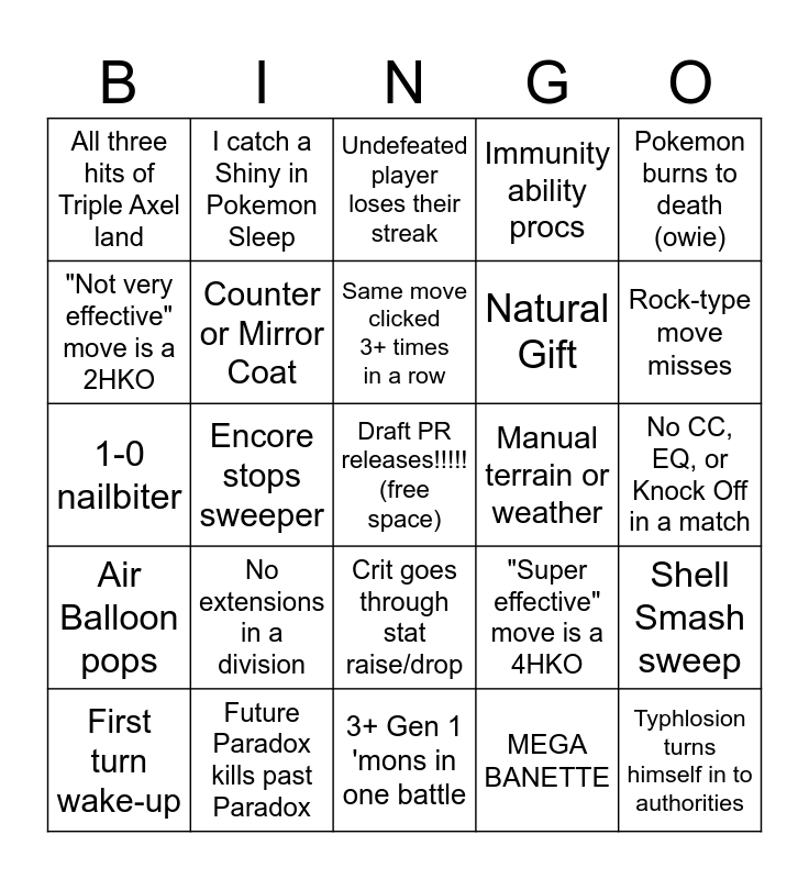This bingo card has a free space and 24 words: No extensions in a division, Future Paradox kills past Paradox, Same move clicked 3+ times in a row, First turn wake-up, Pokemon burns to death (owie), All three hits of Triple Axel land, "Not very effective" move is a 2HKO, I catch a Shiny in Pokemon Sleep, Manual terrain or weather, Crit goes through stat raise/drop, Natural Gift, 1-0 nailbiter, "Super effective" move is a 4HKO, Shell Smash sweep, Counter or Mirror Coat, MEGA BANETTE, No CC, EQ, or Knock Off in a match, Undefeated player loses their streak, Rock-type move misses, Encore stops sweeper, Typhlosion turns himself in to authorities, Air Balloon pops, Immunity ability procs and 3+ Gen 1 'mons in one battle.