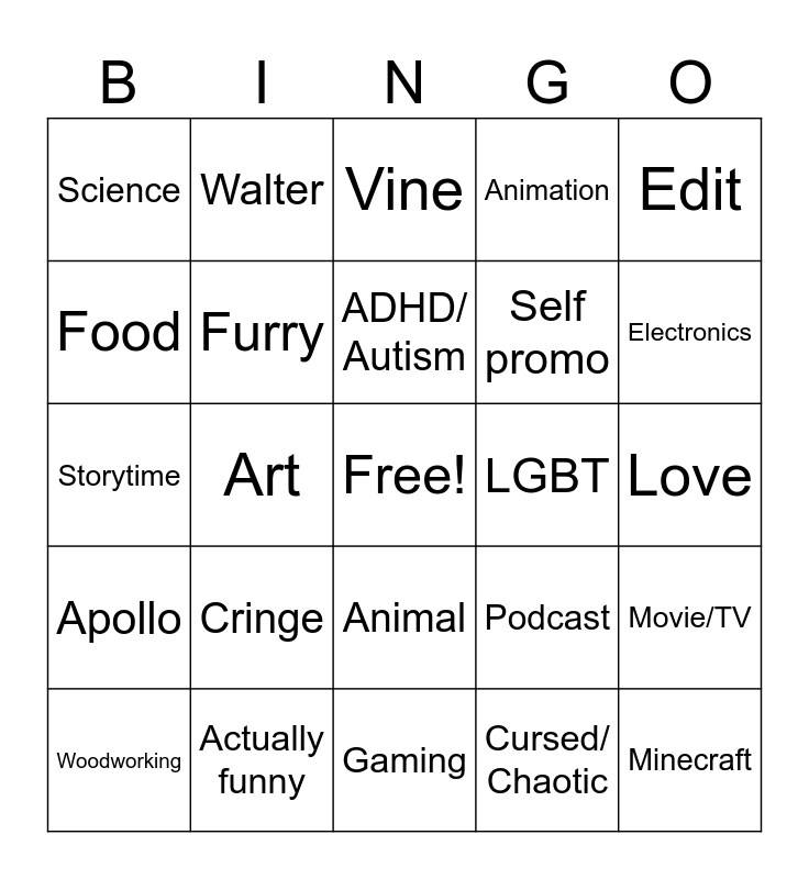 This bingo card has a free space and 49 words: Blender, Minecraft, Brainrot, Gaming, Cringe, Music, Walter, Cat, Food, Celebrity, Furry, Animation, Movie/TV, Podcast, Twitch, Relatable, ADHD/ Autism, LGBT, Meme, Edit, Art, Cursed/ Chaotic, Science, Self promo, Product, Electronics, Woodworking, Rocks, Animal, Apollo, Lego, Offensive, Actually insane, Reddit/ Tumblr, Actually funny, Filter, From TikTok, Car (not a cat), Love, Impression, Dance, Fashion, Satisfying, Just mean, Storytime, Vine, Medical, Reaction and 3D printing.