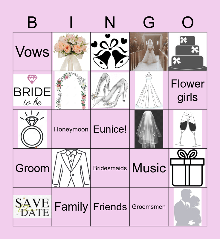 This bingo card has 15 images, a free space and 9 words: Family, Vows, Bridesmaids, Music, Groomsmen, Flower girls, Honeymoon, Groom and Friends.