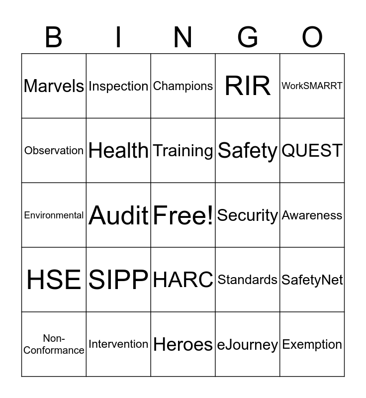 This bingo card has a free space and 24 words: SIPP, Intervention, Training, Non-Conformance, WorkSMARRT, Marvels, Observation, Inspection, Security, HARC, Safety, Environmental, Standards, SafetyNet, Health, eJourney, Awareness, Champions, QUEST, Audit, Exemption, HSE, RIR and Heroes.