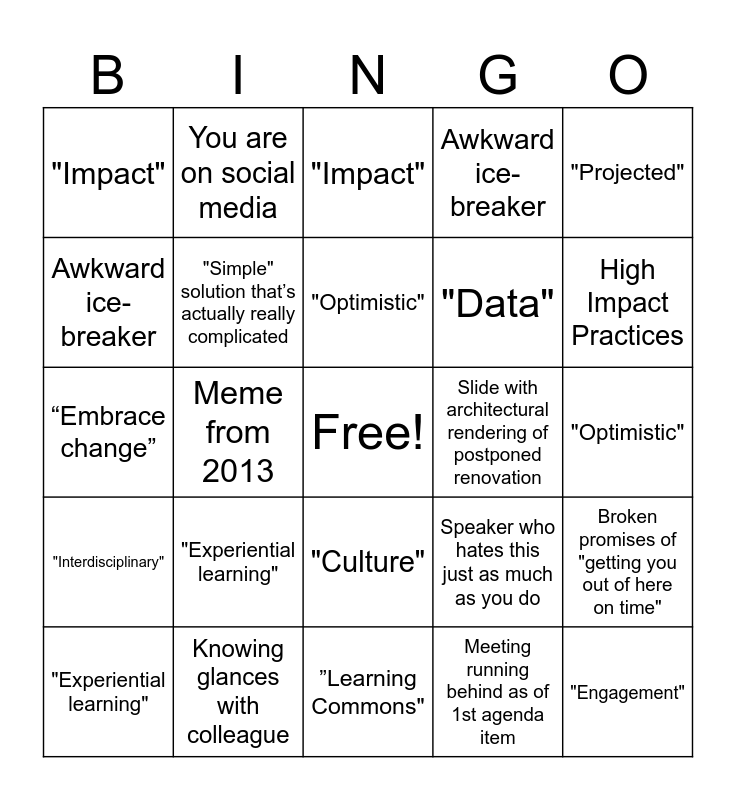 This bingo card has a free space and 120 words: Alma, Another round of introductions, "Answering" a question by restating it as a sentence, "Assessment", At least two phones/devices buzz, Avoiding eye contact, Awkward ice-breaker, Awkward silence after anything speaker says, Broken promises of "getting you out of here on time", Budget cuts, "Collaborate", “Embrace change”, Comments clearly directed at one person but addressed to the group, Complaint about weather, "Create", "Critical thinking", "Culture", "Data", "Empower”, "Engagement", "Experiential learning", "Impact", "Initiatives", At least two phones/devices buzz, "Innovate", "Interdisciplinary", Knowing glances with colleague, ”Learning Commons", "Leverage", "Liaison", Meeting running behind as of 1st agenda item, Meme from 2013, "Optimistic", "Outreach", Over-explaining a bullet point, "Partners", Pens clicking, Person seated next to you is on social media, "Projected", Proposal of action that we’re already doing, Question is really a thinly-veiled boast about the asker’s skillset/role, "Research", Room is freezing, Room is so hot you might die, "Service", Shaky courtesy laughter, "Simple" solution that’s actually really complicated, Slide with architectural rendering of postponed renovation, Someone argues with the speaker, Someone asks a question that only applies to their situation, Speaker dismisses actually good and useful suggestion, Speaker laughs at own joke, Speaker who hates this just as much as you do, Students, High Impact Practices, Technical difficulties, The constant cougher, The too-excited speaker, "Transformative, You are on social media, Alma, Another round of introductions, "Answering" a question by restating it as a sentence, "Assessment", Avoiding eye contact, Awkward ice-breaker, Awkward silence after anything speaker says, Broken promises of "getting you out of here on time", Budget cuts, "Collaborate", “Embrace change”, Comments clearly directed at one person but addressed to the group, Complaint about weather, "Create", "Critical thinking", "Culture", "Data", "Empower”, "Engagement", "Experiential learning", "Impact", "Initiatives", At least two phones/devices buzz, "Innovate", "Interdisciplinary", Knowing glances with colleague, ”Learning Commons", "Leverage", "Liaison", Meeting running behind as of 1st agenda item, Meme from 2013, "Optimistic", "Outreach", Over-explaining a bullet point, "Partners", Pens clicking, Person seated next to you is on social media, "Projected", Proposal of action that we’re already doing, Question is really a thinly-veiled boast about the asker’s skillset/role, "Research", Room is freezing, Room is so hot you might die, "Service", Shaky courtesy laughter, "Simple" solution that’s actually really complicated, Slide with architectural rendering of postponed renovation, Someone argues with the speaker, Someone asks a question that only applies to their situation, Someone loses their train of thought mid-sentence, Speaker dismisses actually good and useful suggestion, Speaker laughs at own joke, Speaker who hates this just as much as you do, Students, High Impact Practices, Technical difficulties, The constant cougher, The too-excited speaker, "Transformative and You are on social media.