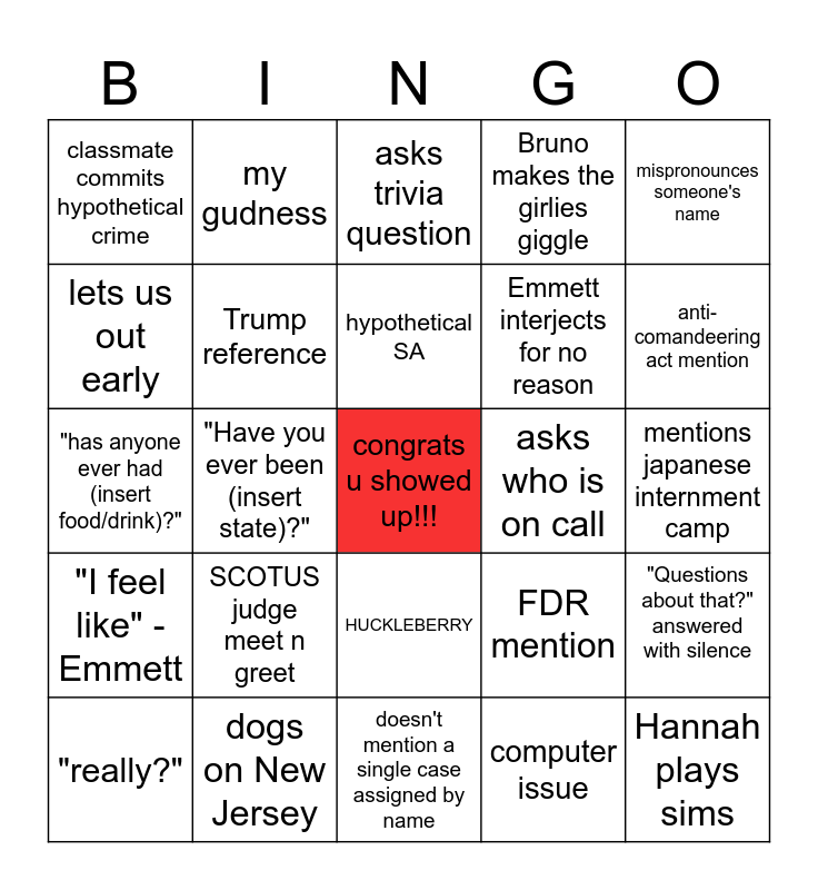 This bingo card has a free space and 24 words: SCOTUS judge meet n greet, dogs on New Jersey, hypothetical SA, "really?", mispronounces someone's name, classmate commits hypothetical crime, lets us out early, my gudness, asks who is on call, HUCKLEBERRY, Emmett interjects for no reason, "has anyone ever had (insert food/drink)?", FDR mention, "Questions about that?" answered with silence, Trump reference, computer issue, mentions japanese internment camp, asks trivia question, anti-comandeering act mention, "Have you ever been (insert state)?", Hannah plays sims, "I feel like" - Emmett, Bruno makes the girlies giggle and doesn't mention a single case assigned by name.