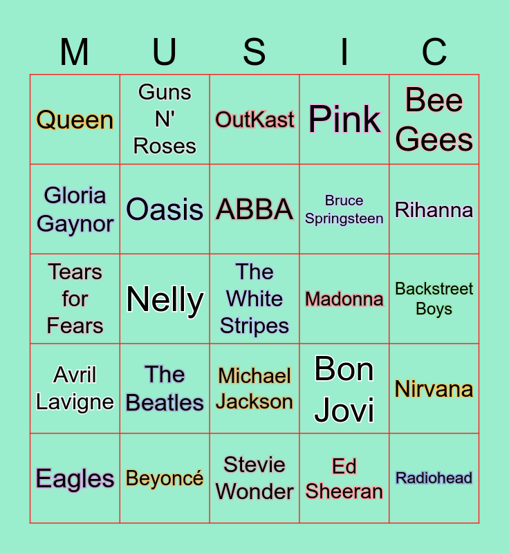 This bingo card has 25 words: The Beatles, Stevie Wonder, ABBA, Eagles, Bee Gees, Queen, Gloria Gaynor, Guns N' Roses, Madonna, Michael Jackson, Bruce Springsteen, Tears for Fears, Bon Jovi, Nirvana, Oasis, Radiohead, Backstreet Boys, OutKast, Rihanna, Nelly, The White Stripes, Beyoncé, Avril Lavigne, Pink and Ed Sheeran.