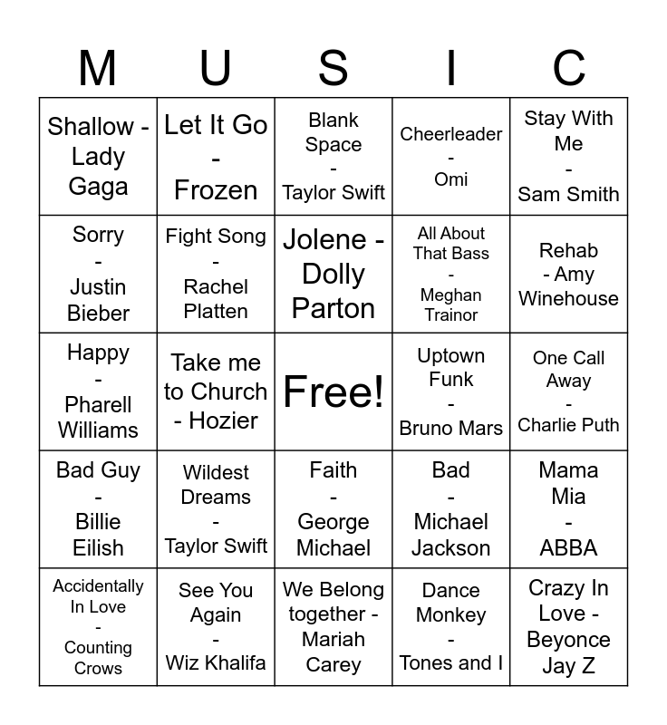 This bingo card has a free space and 24 words: Wildest Dreams - Taylor Swift, See You Again - Wiz Khalifa, Jolene - Dolly Parton, Accidentally In Love - Counting Crows, Stay With Me - Sam Smith, Shallow - Lady Gaga, Sorry - Justin Bieber, Let It Go - Frozen, Uptown Funk - Bruno Mars, Faith - George Michael, All About That Bass - Meghan Trainor, Happy - Pharell Williams, Bad - Michael Jackson, Mama Mia - ABBA, Fight Song - Rachel Platten, Dance Monkey - Tones and I, One Call Away - Charlie Puth, Blank Space - Taylor Swift, Rehab - Amy Winehouse, Take me to Church - Hozier, Crazy In Love - Beyonce Jay Z, Bad Guy - Billie Eilish, Cheerleader - Omi and We Belong together - Mariah Carey.