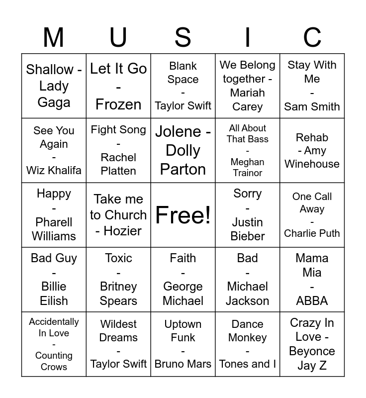 This bingo card has a free space and 24 words: Toxic - Britney Spears, Wildest Dreams - Taylor Swift, Jolene - Dolly Parton, Accidentally In Love - Counting Crows, Stay With Me - Sam Smith, Shallow - Lady Gaga, See You Again - Wiz Khalifa, Let It Go - Frozen, Sorry - Justin Bieber, Faith - George Michael, All About That Bass - Meghan Trainor, Happy - Pharell Williams, Bad - Michael Jackson, Mama Mia - ABBA, Fight Song - Rachel Platten, Dance Monkey - Tones and I, One Call Away - Charlie Puth, Blank Space - Taylor Swift, Rehab - Amy Winehouse, Take me to Church - Hozier, Crazy In Love - Beyonce Jay Z, Bad Guy - Billie Eilish, We Belong together - Mariah Carey and Uptown Funk - Bruno Mars.