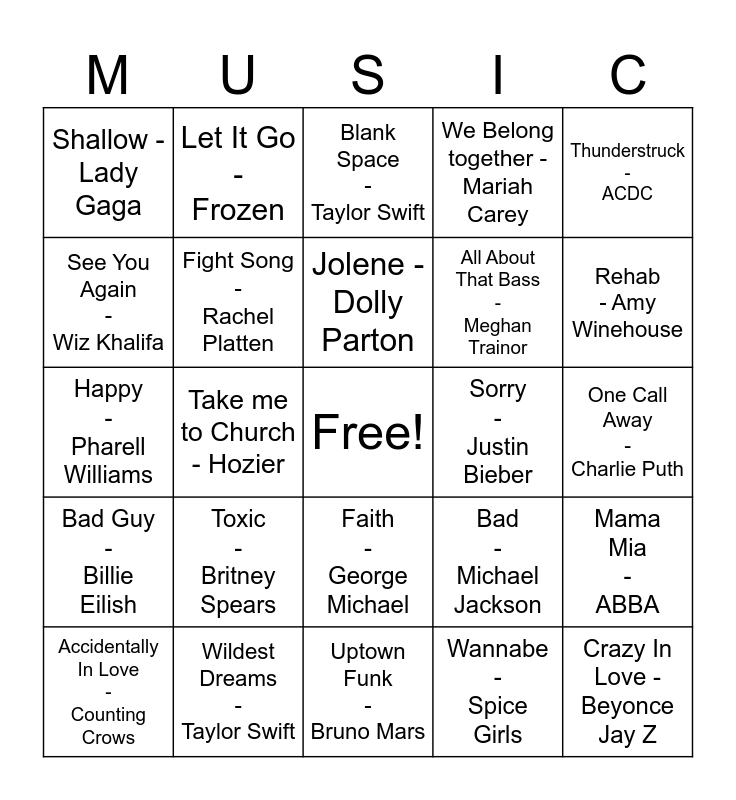 This bingo card has a free space and 24 words: Toxic - Britney Spears, Wildest Dreams - Taylor Swift, Jolene - Dolly Parton, Accidentally In Love - Counting Crows, Thunderstruck - ACDC, Shallow - Lady Gaga, See You Again - Wiz Khalifa, Let It Go - Frozen, Sorry - Justin Bieber, Faith - George Michael, All About That Bass - Meghan Trainor, Happy - Pharell Williams, Bad - Michael Jackson, Mama Mia - ABBA, Fight Song - Rachel Platten, Wannabe - Spice Girls, One Call Away - Charlie Puth, Blank Space - Taylor Swift, Rehab - Amy Winehouse, Take me to Church - Hozier, Crazy In Love - Beyonce Jay Z, Bad Guy - Billie Eilish, We Belong together - Mariah Carey and Uptown Funk - Bruno Mars.