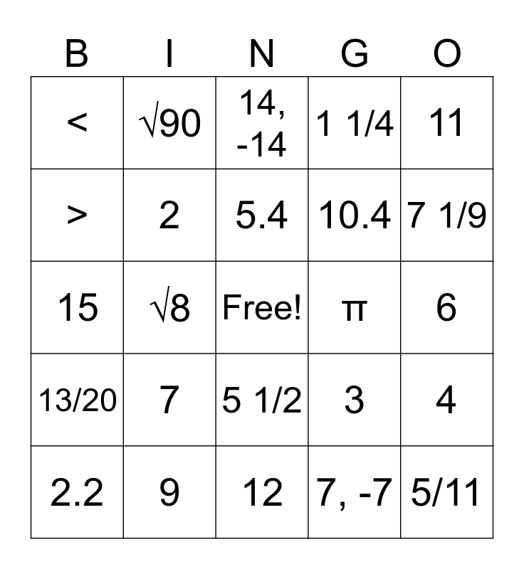 This bingo card has a free space and 24 words: 7, 9, 5.4, 2.2, 11, <, >, √90, π, 5 1/2, 10.4, 15, 3, 4, 2, 7, -7, 6, 14, -14, 7 1/9, √8, 5/11, 13/20, 1 1/4 and 12.