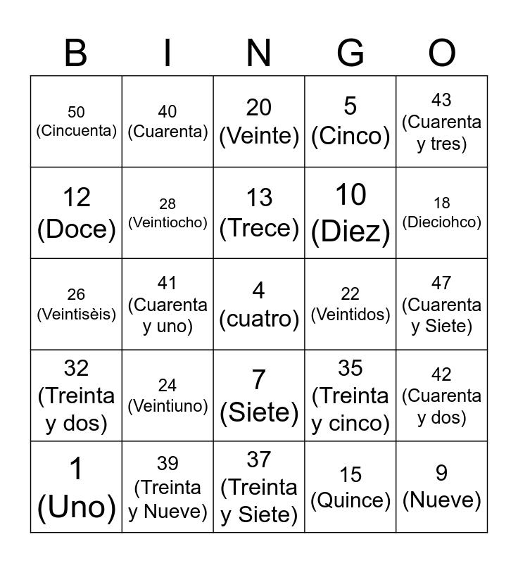 This bingo card has a free space and 24 words: 24 (Veintiuno), 39 (Treinta y Nueve), 13 (Trece), 1 (Uno), 43 (Cuarenta y tres), 50 (Cincuenta), 12 (Doce), 40 (Cuarenta), 22 (Veintidos), 7 (Siete), 10 (Diez), 26 (Veintisèis), 35 (Treinta y cinco), 42 (Cuarenta y dos), 28 (Veintiocho), 15 (Quince), 47 (Cuarenta y Siete), 20 (Veinte), 18 (Dieciohco), 41 (Cuarenta y uno), 9 (Nueve), 32 (Treinta y dos), 5 (Cinco) and 37 (Treinta y Siete).