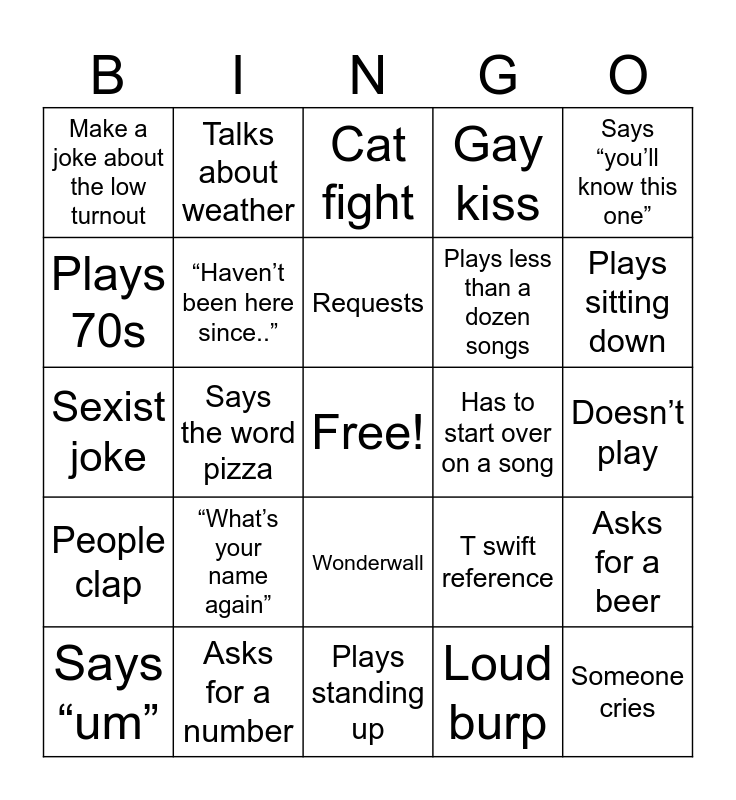 This bingo card has a free space and 24 words: “What’s your name again”, Asks for a number, Requests, Says “um”, Says “you’ll know this one”, Make a joke about the low turnout, Plays 70s, Talks about weather, Has to start over on a song, Wonderwall, Plays less than a dozen songs, Sexist joke, T swift reference, Asks for a beer, “Haven’t been here since..”, Loud burp, Doesn’t play, Cat fight, Plays sitting down, Says the word pizza, Someone cries, People clap, Gay kiss and Plays standing up.