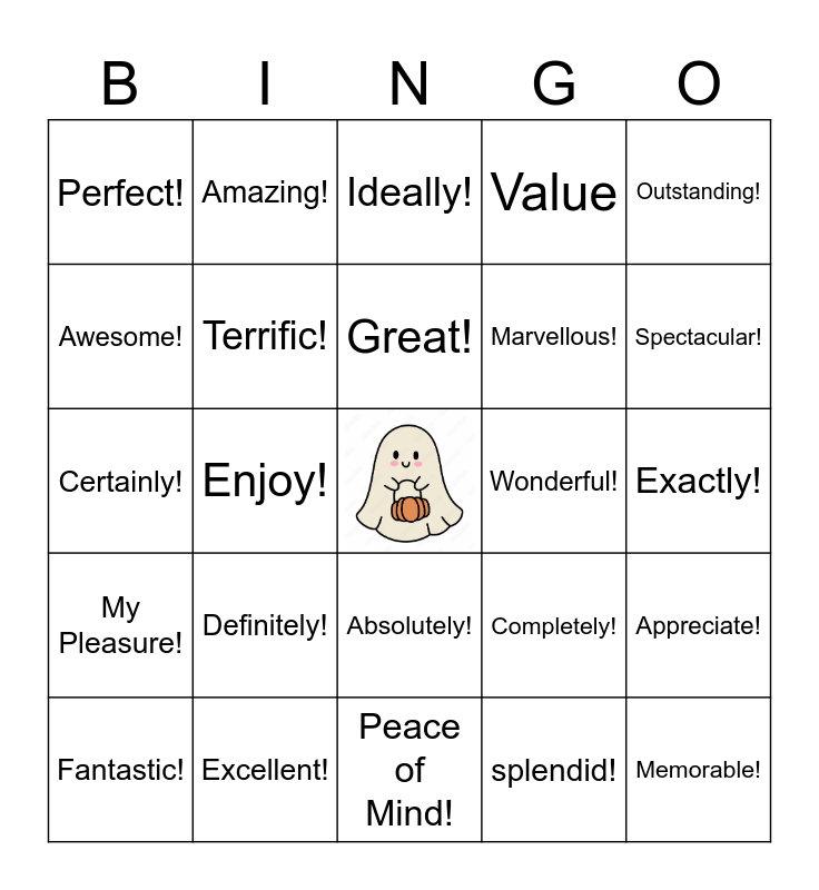 This bingo card has a free space and 24 words: Definitely!, Excellent!, Great!, Fantastic!, Outstanding!, Perfect!, Awesome!, Amazing!, Wonderful!, Absolutely!, Marvellous!, Certainly!, Completely!, Appreciate!, Terrific!, splendid!, Exactly!, Ideally!, Spectacular!, Enjoy!, Memorable!, My Pleasure!, Value and Peace of Mind!.