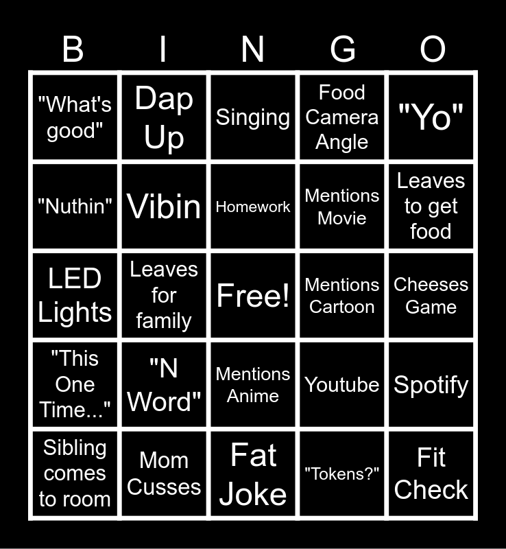 This bingo card has a free space and 24 words: "N Word", Mom Cusses, Homework, Sibling comes to room, "Yo", "What's good", "Nuthin", Dap Up, Mentions Cartoon, Mentions Anime, Mentions Movie, LED Lights, Youtube, Spotify, Vibin, "Tokens?", Cheeses Game, Singing, Leaves to get food, Leaves for family, Fit Check, "This One Time...", Food Camera Angle and Fat Joke.
