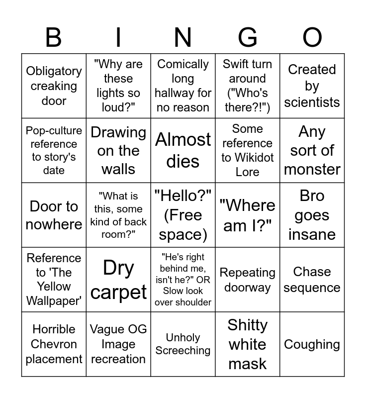 This bingo card has a free space and 29 words: Horrible Chevron placement, Vague Kane Pixels reference, "What is this, some kind of back room?", No-clips, Obligatory creaking door, Comically long hallway for no reason, Drawing on the walls, Dry carpet, "Where am I?", Vague OG Image recreation, Bro goes insane, Coughing, Unholy Screeching, Shitty white mask, Any sort of monster, Into sequence with random dude that dies, "He's right behind me, isn't he?" OR Slow look over shoulder, Reference to 'The Yellow Wallpaper', Created by scientists, Door to nowhere, Repeating doorway, Strangely placed chair, Some reference to Wikidot Lore, Pop-culture reference to story's date, Swift turn around ("Who's there?!"), "Why are these lights so loud?", Chase sequence, Almost dies and Different area (not yellow).
