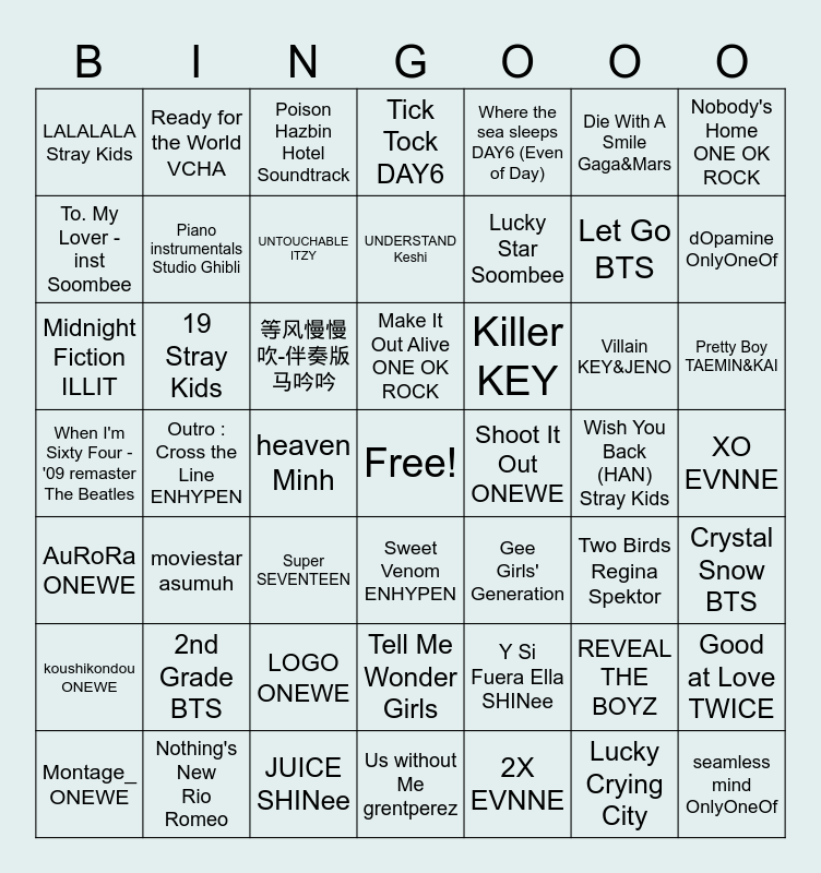 This bingo card has a free space and 55 words: 2X EVNNE, Pretty Boy TAEMIN&KAI, No Die Flower Soombee, LALALALA Stray Kids, Outro : Cross the Line ENHYPEN, 2nd Grade BTS, Nobody's Home ONE OK ROCK, Identify Timeless Ideals, Piano instrumentals Studio Ghibli, LOGO ONEWE, Tick Tock DAY6, Crystal Snow BTS, XO EVNNE, Wish You Back (HAN) Stray Kids, Montage_ ONEWE, AuRoRa ONEWE, Where the sea sleeps DAY6 (Even of Day), Lucky Star Soombee, Lucky Crying City, Let Go BTS, dOpamine OnlyOneOf, moviestar asumuh, Killer KEY, Poison Hazbin Hotel Soundtrack, Melt Down DAY6, To. My Lover - inst Soombee, heaven Minh, Homesick wave to earth, Midnight Fiction ILLIT, Villain KEY&JENO, Get Up NewJeans, Two Birds Regina Spektor, Good at Love TWICE, Nothing's New Rio Romeo, Die With A Smile Gaga&Mars, UNDERSTAND Keshi, koushikondou ONEWE, 19 Stray Kids, seamless mind OnlyOneOf, Super SEVENTEEN, Ready for the World VCHA, Tell Me Wonder Girls, Y Si Fuera Ella SHINee, Allergy (G)I-DLE, 等风慢慢吹-伴奏版 马吟吟, When I'm Sixty Four - '09 remaster The Beatles, JUICE SHINee, Gee Girls' Generation, Shoot It Out ONEWE, UNTOUCHABLE ITZY, Sweet Venom ENHYPEN, REVEAL THE BOYZ, Us without Me grentperez, Make It Out Alive ONE OK ROCK and Day That I Died WOOSUNG.