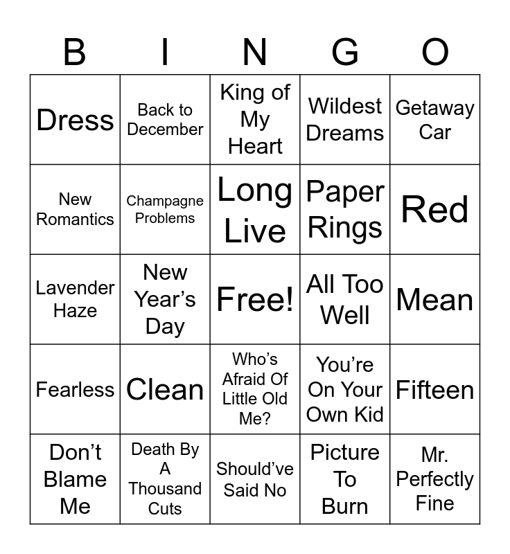 This bingo card has a free space and 24 words: Clean, Death By A Thousand Cuts, Long Live, Don’t Blame Me, Getaway Car, Dress, New Romantics, Back to December, All Too Well, Who’s Afraid Of Little Old Me?, Paper Rings, Lavender Haze, You’re On Your Own Kid, Fifteen, Champagne Problems, Picture To Burn, Mean, King of My Heart, Red, New Year’s Day, Mr. Perfectly Fine, Fearless, Wildest Dreams and Should’ve Said No.