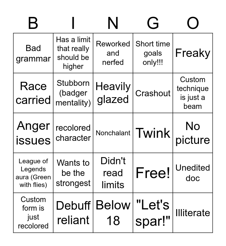 This bingo card has 25 words: Wants to be the strongest, Below 18, Heavily glazed, Custom form is just recolored, Freaky, Bad grammar, Race carried, Has a limit that really should be higher, Twink, Didn't read limits, Crashout, Anger issues, Free!, Unedited doc, Stubborn (badger mentality), Illiterate, No picture, Reworked and nerfed, Custom technique is just a beam, recolored character, Nonchalant, Debuff reliant, League of Legends aura (Green with flies), Short time goals only!!! and "Let's spar!".