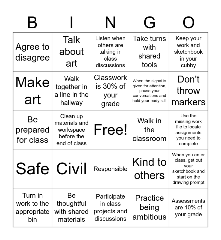 This bingo card has a free space and 38 words: Ask permission to use tools or materials in the art room, Keep your body to yourself, Always respectful, Walk together in a line in the hallway, When you enter class, get out your sketchbook and start on the drawing prompt, Civil, Classwork is 30% of your grade, Write about art, Keep your work and sketchbook in your cubby, When the signal is given for attention, pause your conversations and hold your body still, Clean up materials and workspace before the end of class, Take turns with shared tools, Assessments are 10% of your grade, Use the missing work file to locate assignments you need to complete, Make art, Safe, Do not touch other people's things, including artwork, Listen when others are talking in class discussions, Use professional language, Walk in the classroom, Agree to disagree, Be thoughtful with shared materials, Don't throw markers, Turn in work to the appropriate bin, Learn about yourself through art, Participate in class projects and discussions, You get three passes out of class per quarter, Put your name on your work, Work to the best of your ability, Walk with a purpose, Projects are 60% of your grade, Responsible, Practice being ambitious, Talk about art, Keep an open mind, Kind to others, Be prepared for class and Raise your hand when you have a need, question or comment.