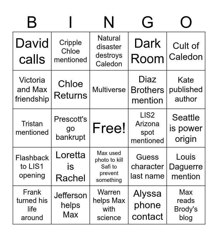 This bingo card has a free space and 24 words: Loretta is Rachel, Jefferson helps Max, Multiverse, Frank turned his life around, Cult of Caledon, David calls, Victoria and Max friendship, Cripple Chloe mentioned, LIS2 Arizona spot mentioned, Max used photo to kill Safi to prevent something, Diaz Brothers mention, Tristan mentioned, Guess character last name, Louis Daguerre mention, Chloe Returns, Alyssa phone contact, Seattle is power origin, Natural disaster destroys Caledon, Kate published author, Prescott's go bankrupt, Max reads Brody's blog, Flashback to LIS1 opening, Dark Room and Warren helps Max with science.