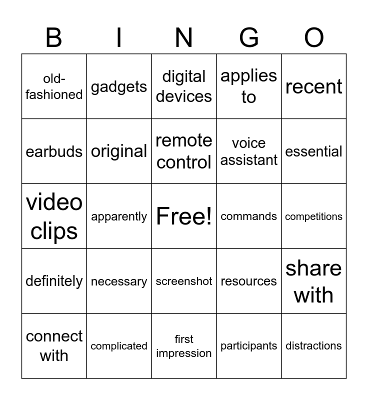 This bingo card has a free space and 24 words: necessary, complicated, remote control, connect with, recent, old-fashioned, earbuds, gadgets, commands, screenshot, voice assistant, video clips, resources, share with, original, participants, competitions, digital devices, essential, apparently, distractions, definitely, applies to and first impression.