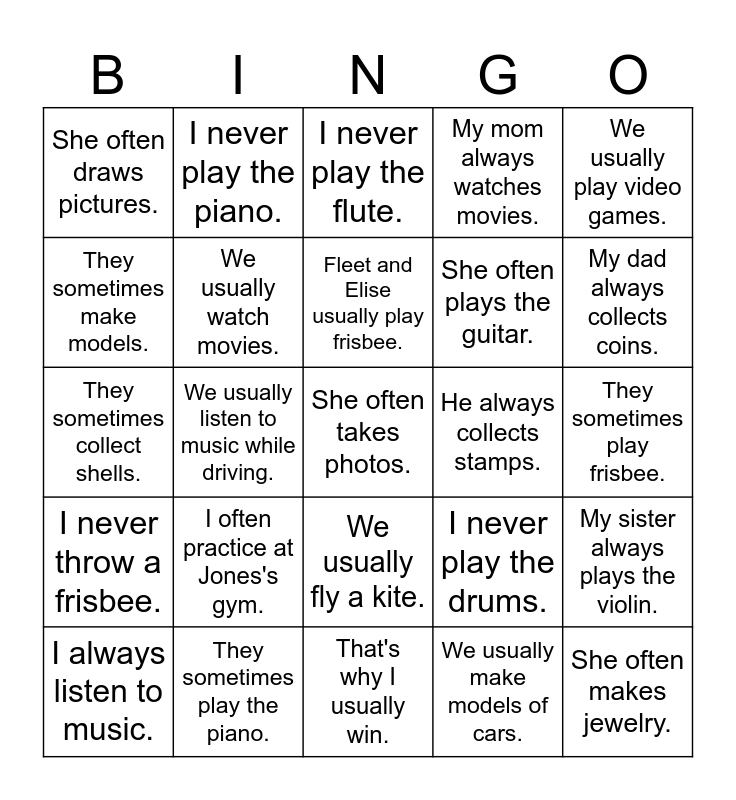 This bingo card has 25 words: I often practice at Jones's gym., That's why I usually win., Fleet and Elise usually play frisbee., I always listen to music., We usually play video games., She often draws pictures., They sometimes make models., I never play the piano., He always collects stamps., We usually fly a kite., She often plays the guitar., They sometimes collect shells., I never play the drums., My sister always plays the violin., We usually watch movies., She often makes jewelry., They sometimes play frisbee., I never play the flute., My dad always collects coins., We usually listen to music while driving., She often takes photos., They sometimes play the piano., I never throw a frisbee., My mom always watches movies. and We usually make models of cars..