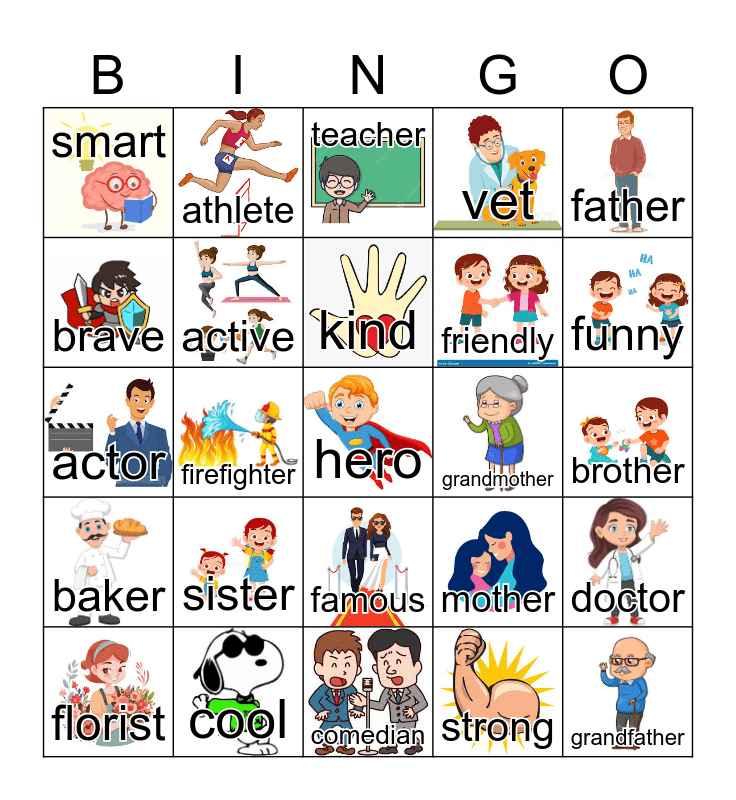 This bingo card has 24 images, a free space and 24 words: sister, cool, kind, florist, father, smart, brave, athlete, grandmother, famous, friendly, actor, mother, doctor, active, strong, brother, teacher, funny, firefighter, grandfather, baker, vet and comedian.