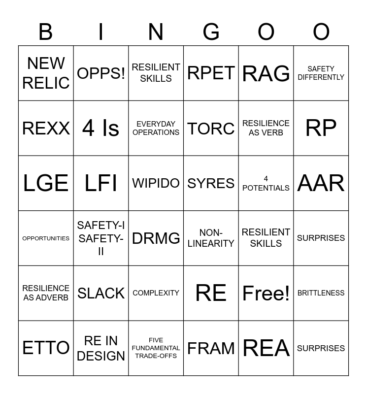 This bingo card has 37 words: Free!, RE, REA, REXX, SAFETY-I SAFETY-II, 4 POTENTIALS, 4 Is, FRAM, RAG, ETTO, RP, RPET, LGE, WIPIDO, SAFETY DIFFERENTLY, SYRES, SLACK, RESILIENT SKILLS, AAR, LFI, NEW RELIC, TORC, DRMG, RESILIENT SKILLS, RE IN DESIGN, SURPRISES, OPPS!, FIVE FUNDAMENTAL TRADE-OFFS, BRITTLENESS, COMPLEXITY, EMERGENCE, NON-LINEARITY, RESILIENCE AS VERB, RESILIENCE AS ADVERB, OPPORTUNITIES, EVERYDAY OPERATIONS and SURPRISES.