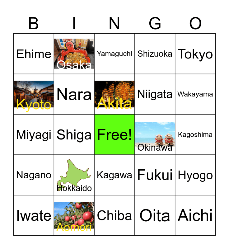 This bingo card has 6 images, a free space and 24 words: Hokkaido, Aomori, Akita, Iwate, Tokyo, Ehime, Kyoto, Osaka, Okinawa, Kagawa, Niigata, Miyagi, Fukui, Hyogo, Nara, Oita, Kagoshima, Yamaguchi, Wakayama, Shiga, Aichi, Nagano, Shizuoka and Chiba.