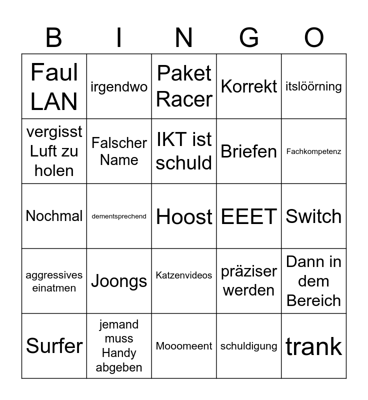 This bingo card has a free space and 37 words: Meine Damen und Herren, Kopf auf den Pult legen, Du hast die Macht, Falscher Name, Dann in dem Bereich, Joongs, IKT ist schuld, dann in dem Moment, itslöörning, Rosa Riese, dementsprechend, Korrekt, trank, Switch, vergisst Luft zu holen, aggressives einatmen, NEEIIIIN, Paket Racer, Katzenvideos, EEET, Faul LAN, Fachkompetenz, Surfer, Mooomeent, und solche Geschichten, schuldigung, irgendwo, und ähnliche sonne Sachen, damit würde ich ... beenden, agieren, verschluckt ein Wort, jemand muss Handy abgeben, Nochmal, Bidde, präziser werden, Briefen and Stadtwerke ist schuld.