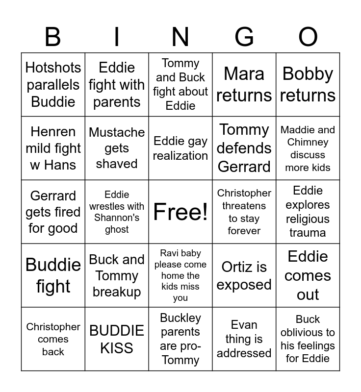This bingo card has a free space and 24 words: Buck and Tommy breakup, BUDDIE KISS, Eddie gay realization, Christopher comes back, Bobby returns, Hotshots parallels Buddie, Henren mild fight w Hans, Eddie fight with parents, Christopher threatens to stay forever, Ravi baby please come home the kids miss you, Tommy defends Gerrard, Gerrard gets fired for good, Ortiz is exposed, Eddie comes out, Mustache gets shaved, Evan thing is addressed, Eddie explores religious trauma, Tommy and Buck fight about Eddie, Maddie and Chimney discuss more kids, Eddie wrestles with Shannon's ghost, Buck oblivious to his feelings for Eddie, Buddie fight, Mara returns and Buckley parents are pro-Tommy.