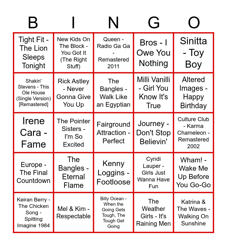 This bingo card has 49 words: Free!, Fairground Attraction - Perfect, Wham! - Freedom - Single Version, Billy Ocean - When the Going Gets Tough, The Tough Get Going, The Bangles - Eternal Flame, Bonnie Tyler - Total Eclipse of the Heart, New Kids On The Block - You Got It (The Right Stuff), Adam & The Ants - Stand and Deliver, Shakin' Stevens - This Ole House (Single Version) [Remastered], S'Express - Theme from S-Express, Rick Astley - Never Gonna Give You Up, Bros - I Owe You Nothing, Wham! - Wake Me Up Before You Go-Go, Cyndi Lauper - Girls Just Wanna Have Fun, Survivor - Eye of the Tiger, Ray Parker Jr. - Ghostbusters, The Bangles - Walk Like an Egyptian, Journey - Don't Stop Believin', Dolly Parton - 9 to 5, Sinitta - Toy Boy, The Pointer Sisters - I'm So Excited, The Weather Girls - It's Raining Men, Tight Fit - The Lion Sleeps Tonight, Milli Vanilli - Girl You Know It's True, Four Tops - Loco in Acapulco, Altered Images - Happy Birthday, Keiran Berry - The Chicken Song - Spitting Imagine 1984, Dead Or Alive - You Spin Me Round (Like a Record), Kenny Loggins - Footloose, Europe - The Final Countdown, Run–D.M.C. - Walk This Way (feat. Aerosmith) - 7" Single Version, Technotronic - Pump Up The Jam, Kylie Minogue - I Should Be So Lucky, Brother Beyond - The Harder I Try, Mel & Kim - Respectable, Yazz - The Only Way Is Up, Samantha Fox - Touch Me (I Want Your Body), Bananarama - Cruel Summer, Culture Club - Karma Chameleon - Remastered 2002, Kim Wilde - Kids In America, Irene Cara - What A Feeling, Frankie Goes To Hollywood - Relax, Katrina & The Waves - Walking On Sunshine, ABBA - Super Trouper, Irene Cara - Fame, Queen - Radio Ga Ga - Remastered 2011, Tiffany - I Think We're Alone Now, Sister Sledge - We Are Family - 1995 Remaster and Whitney Houston - I Wanna Dance with Somebody (Who Loves Me).