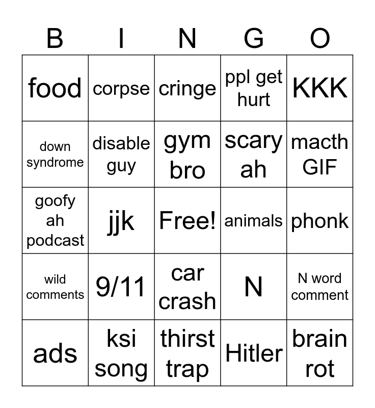 This bingo card has a free space and 24 words: 9/11, ksi song, gym bro, ads, KKK, food, down syndrome, corpse, animals, car crash, scary ah, goofy ah podcast, N, N word comment, disable guy, Hitler, phonk, cringe, macth GIF, jjk, brain rot, wild comments, ppl get hurt and thirst trap.