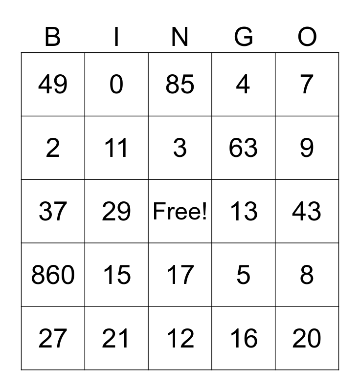 This bingo card has a free space and 30 words: 21, 800, 29, 424, 49, 85, 11, 17, 13, 12, 43, 20, 16, 10, 9, 6, 5, 860, 15, 7, 37, 14, 0, 63, 2, 4, 8, 27, 3 and 18.