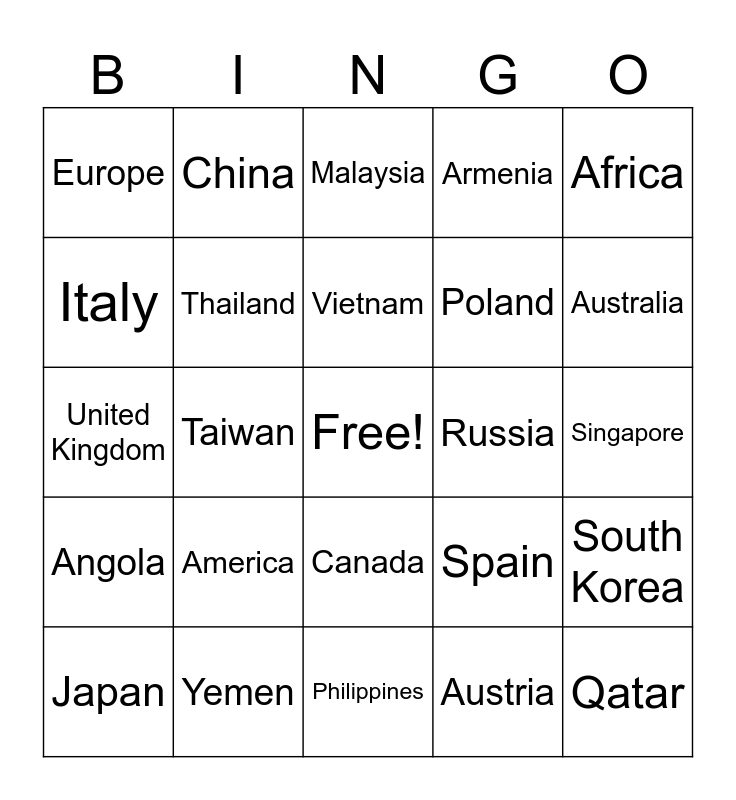 This bingo card has a free space and 25 words: America, Philippines, Vietnam, Japan, Africa, Europe, Italy, China, Russia, Canada, Poland, United Kingdom, Spain, South Korea, Thailand, New Zealand, Singapore, Malaysia, Australia, Taiwan, Qatar, Yemen, Angola, Armenia and Austria.