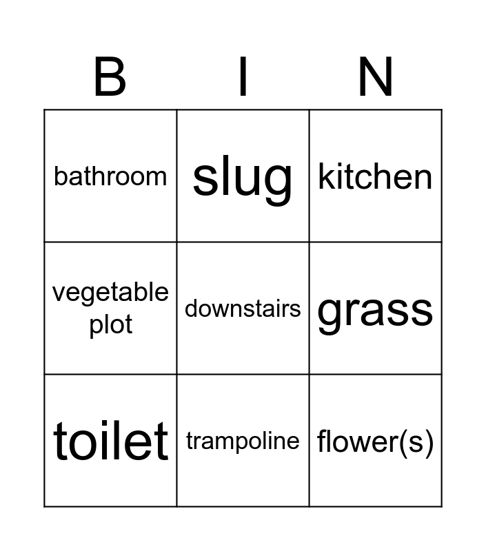 This bingo card has 30 words: flat, apartment, address, bedroom, bathroom, kitchen, toilet, stairs, hall, closet, bookcase, cupboard, window, carpet, lamp, mirror, wardrobe, wall, upstairs, downstairs, garden, plants, slug, flower(s), grass, vegetable plot, shrubs, balcony, trampoline and sprinkler.